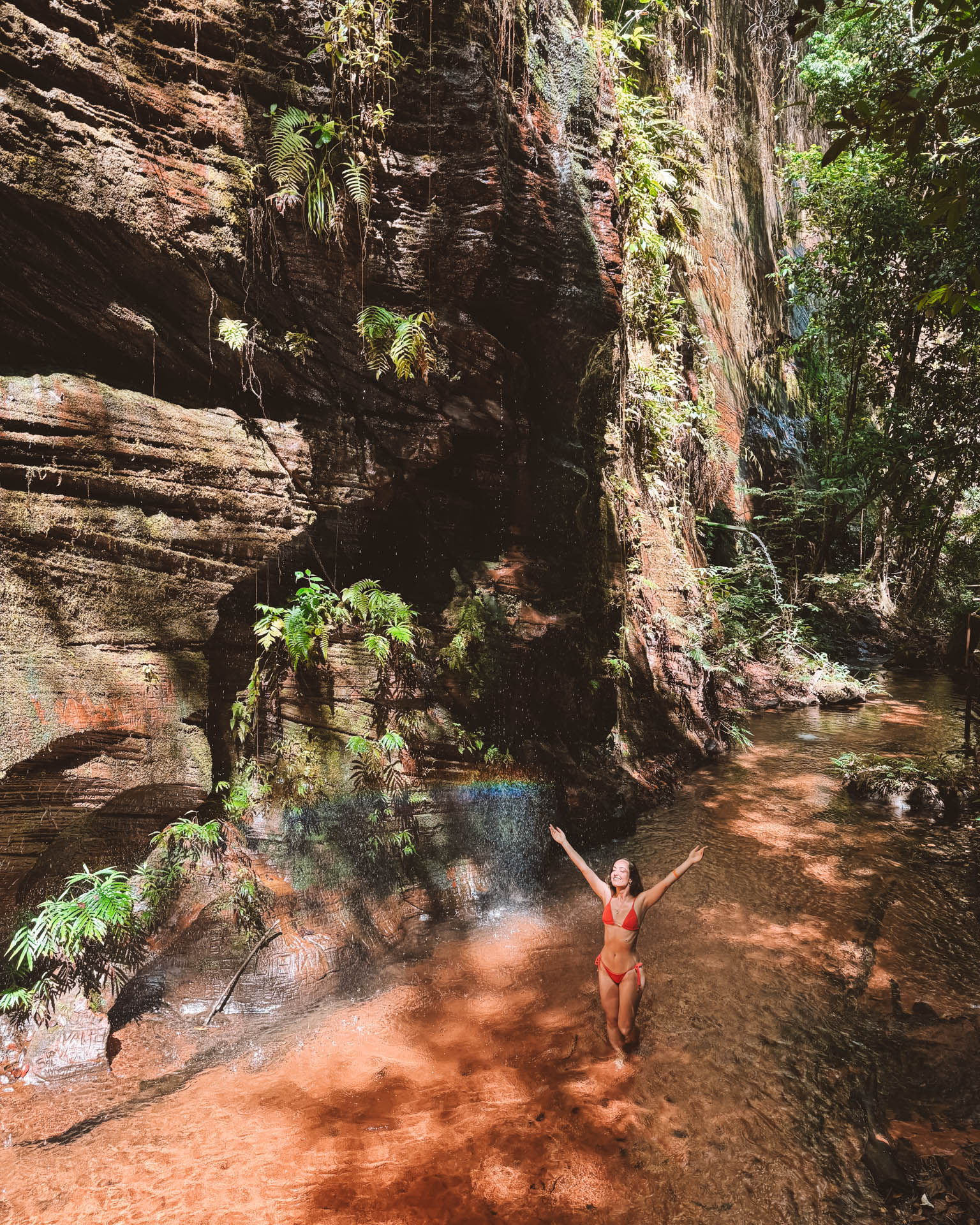 Durante o percurso, é possível observar de perto a fauna e a flora locais, tornando a caminhada ainda mais interessante. Ao final, o esforço é recompensado por um visual de tirar o fôlego: você adentra um cânion e não imagina que vai encontrar uma cachoeira imponente de 40m com andorinhas voando sobre a sua cabeça. É realmente impressionante!!