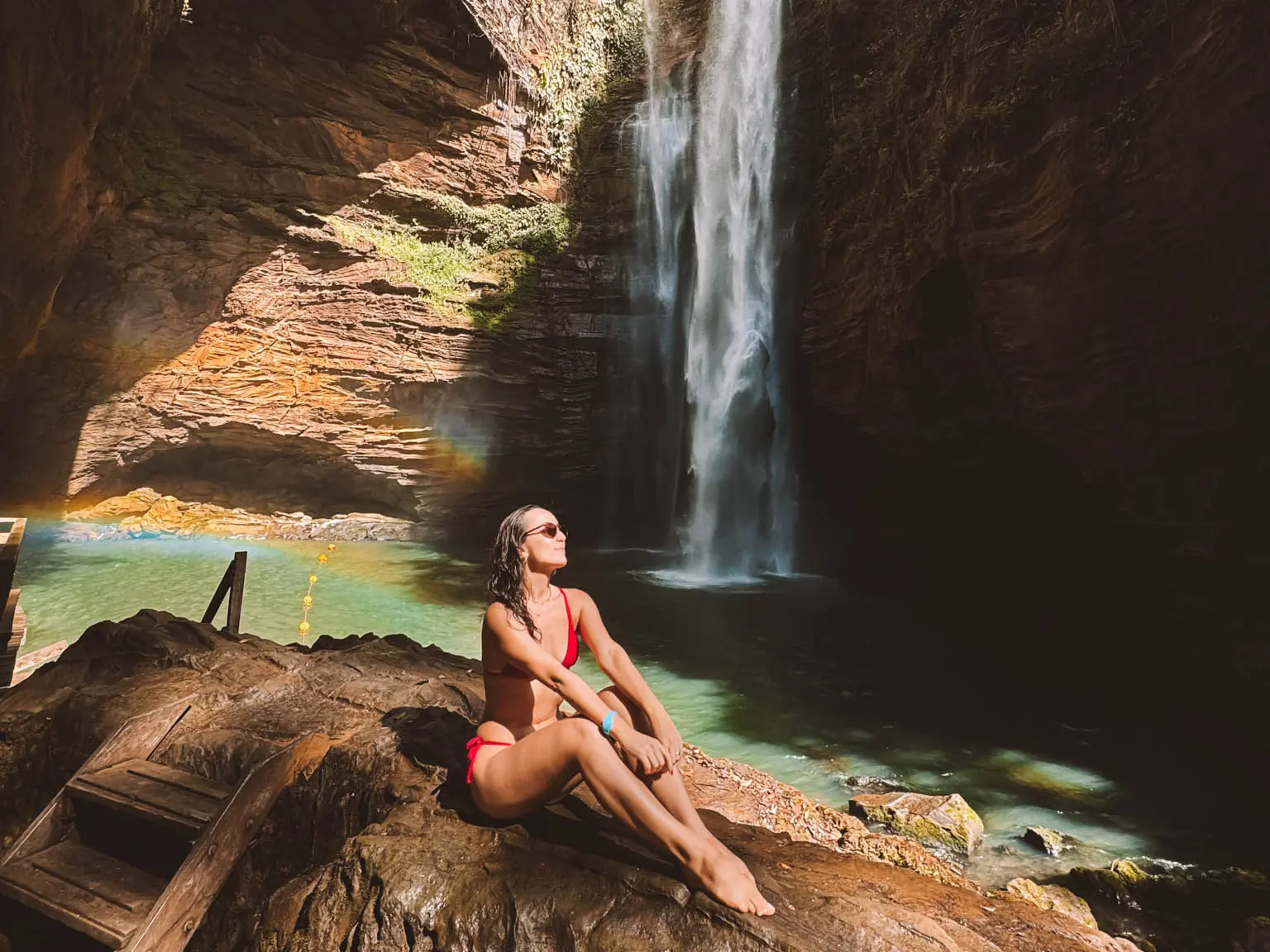 A cachoeira, ainda pouco conhecida, está em uma área mais isolada, acessível por uma trilha que atravessa paisagens selvagens e exuberantes. Com uma queda d’água longa, a cor da água tem tons que misturam o azul e o verde de uma maneira impressionante. E é só você ali, com seu pequeno grupo, curtindo a natureza com aquele aspecto de intocada!