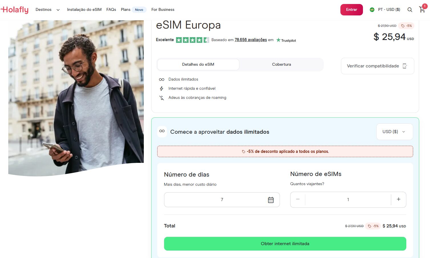 Além disso, vale saber que os pacotes de eSIM Holafly com desconto têm internet ilimitada! Isso é uma verdadeira mão na roda, especialmente para os heavy users, que necessitam de mais dados.