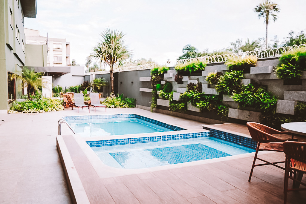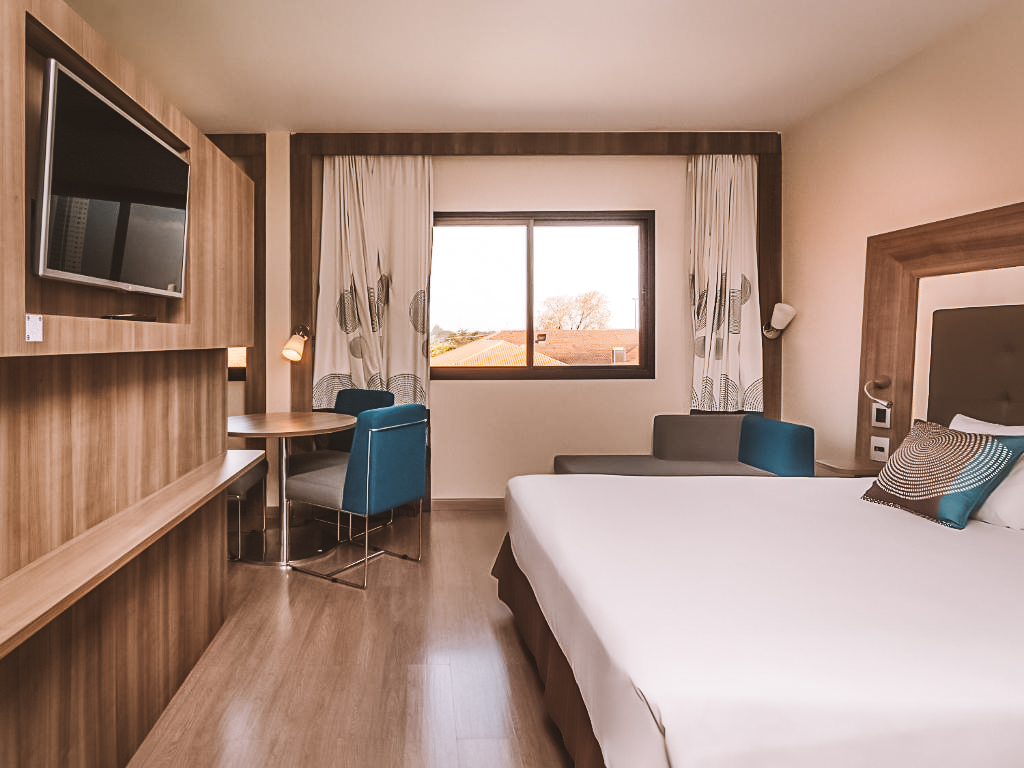 Os quartos são simples e funcionais, atendendo bem quem procura conforto sem excessos, enquanto as suítes oferecem um diferencial com banheira de hidromassagem. O hotel também se destaca pela piscina na cobertura, com vista para a cidade, e pelo café da manhã farto e muito elogiado pelos hóspedes, servido no restaurante do próprio hotel.