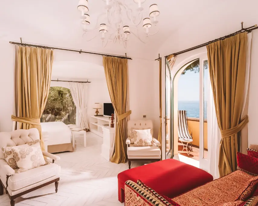 Os quartos apresentam decoração clássica mediterrânea, com piso em madeira, azulejos típicos e as unidades possuem sacada ou terraço privativo com vista para o mar de Positano. O café da manhã pode ser servido em seu quarto mediante solicitação
