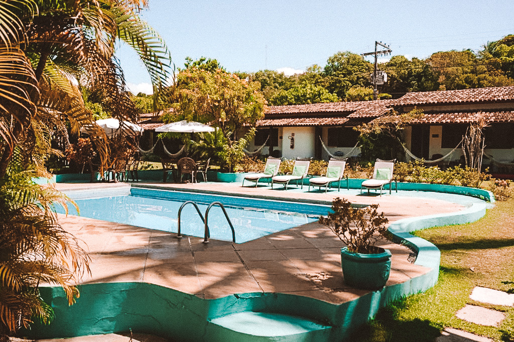Um jardim com uma bela piscina, bem convidativa aguardam os hóspedes. O melhor é que ela também é pet friendly além de oferecer um bom custo benefício. Ideal para quem busca pousadas pet friendly em Cumuruxatiba.
