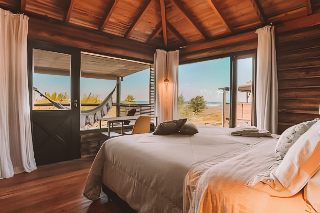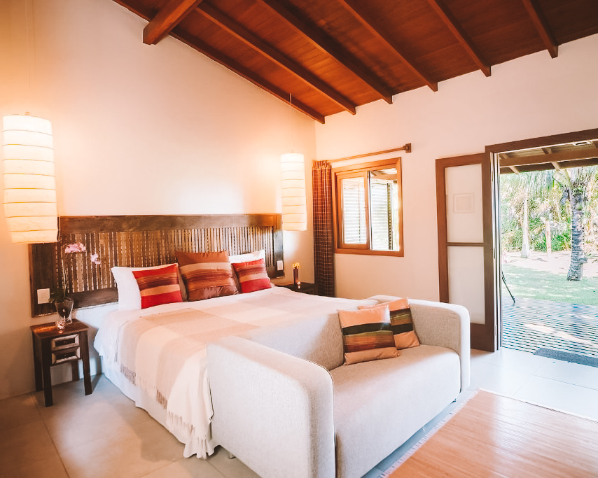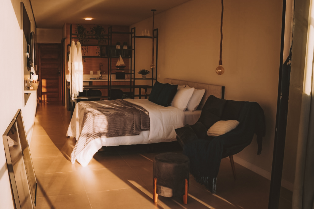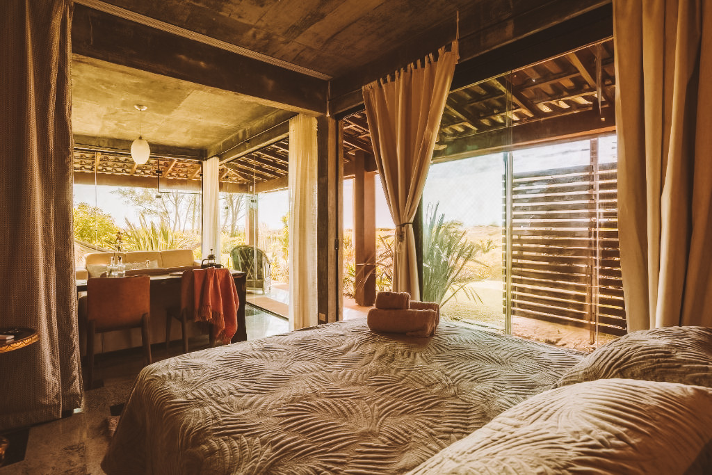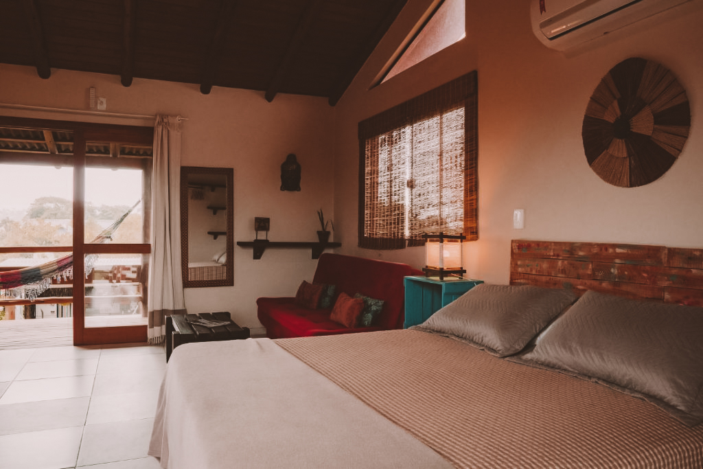 Os quartos são nossa parte favorita dessa acomodação. As acomodações são amplas, arejadas e decoradas com materiais naturais que dão um toque super aconchegante. Muitas unidades ainda contam com varandas privativas equipadas com redes para relaxar depois da praia.