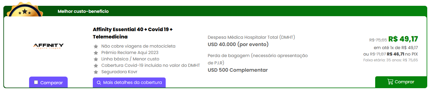 O valor do seguro viagem Affinity Essential 40 AL + Covid 19 + Telemedicina para 7 dias é de R$ 46,71 no Pix ou R$ 49,17 em até 1 x no cartão.