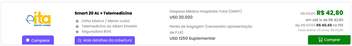 - Já o ITA 60 Am. Lat + Covid 19 que custa em torno de R$ 51,36 para uma viagem de uma semana, é um seguro bem em conta. Essa opção custeia USD 60 mil em despesas médico-hospitalares.