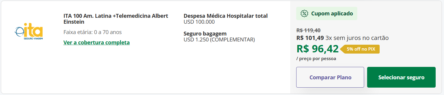 - ITA 100 América Latina + Telemedicina Albert Einstein: oferece uma ótima cobertura médica de USD 100.000, O valor do plano é R$119,40, mas com o cupom sai por R$101,49.