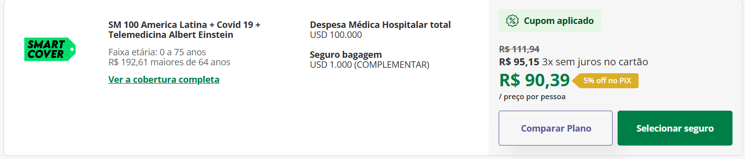 - SM 100 América Latina + Covid-19 + Telemedicina Albert Einstein: um plano com excelente custo-benefício, com DMH de USD 100.000. Cobre ainda USD 1.000 para bagagem extraviada. Para 7 dias, o valor fica R$ 95,99 em até 3x.