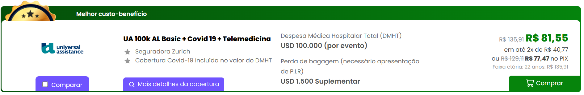 - UA 100k AL Basic + Covid-19 + Telemedicina: com cobertura de USD 100.000, inclui telemedicina, cobertura para bagagem extraviada, despesas farmacêuticas, emergência odontológica, atraso de voo e cancelamento de viagem. Com o nosso cupom, ele sai por R$ 81,55.