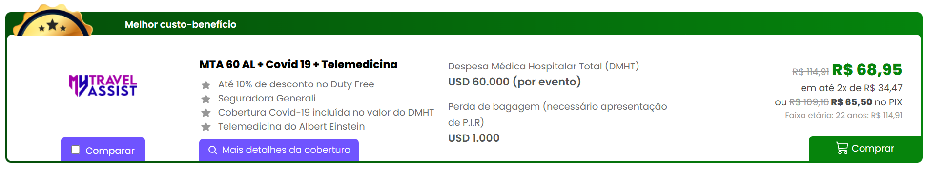 - MTA 60 AL + Covid-19 + Telemedicina: oferece USD 60.000 em despesas médico-hospitalares. Ele oferece também seguro bagagem e cancelamento de viagem, é ideal para quem quer mais coberturas extras sem gastar muito. Com o cupom AVENTURAS15 ele sai por apenas R$ 68,95