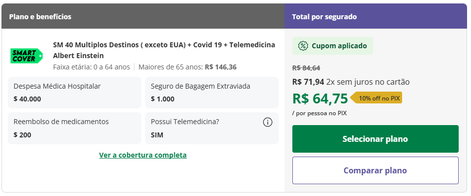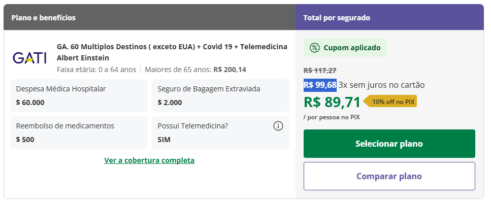 Em uma semana de viagem, ele oferece um bom custo benefício, fica em torno de R$71,94 em 2 x sem juros ou R$64,75 no PIX. A faixa etária é até os 64 anos. Idosos acima de 65 devem investir R$ 146,36.