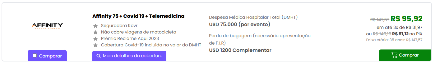 - O Affinity Essential 55 + Covid 19 + Telemedicina, possui cobertura de USD 55 mil em despesas médico-hospitalares e USD 500 em seguro bagagem. Uma semana sai a R$ 58,03.
