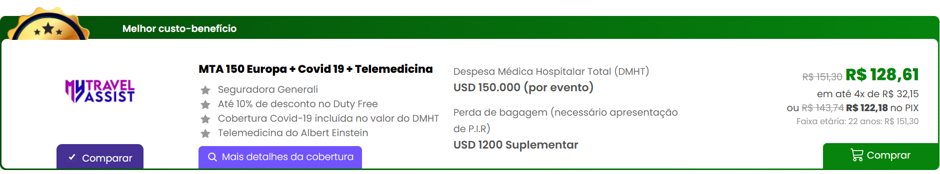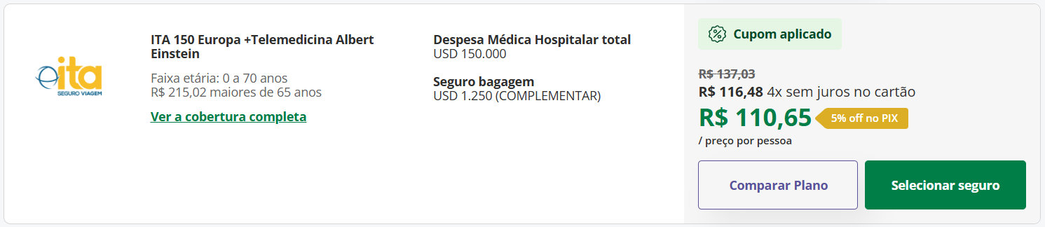 - ITA 150 Europa + Telemedicina Albert Einstein: uma excelente escolha para quem quer viajar com segurança e atendimento médico de ponta. O plano oferece USD 150.000 de cobertura médica. O valor para 7 dias é de R$137,03, mas com o cupom AVENTURAS15, o preço cai para R$116,48. Pagando via PIX, o total fica em R$110,65.