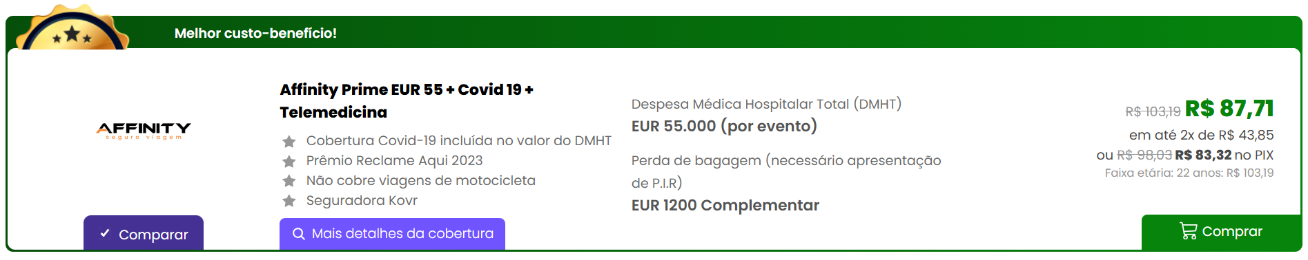 - Affinity Prime EUR 55 + Covid 19 + Telemedicina: seguro viagem Noruega com excelente custo x benefício. O valor para 7 dias é de R$103,19, mas com o cupom AVENTURAS15, o preço cai para R$87,71. Pagando via PIX, o total fica em R$83,32.