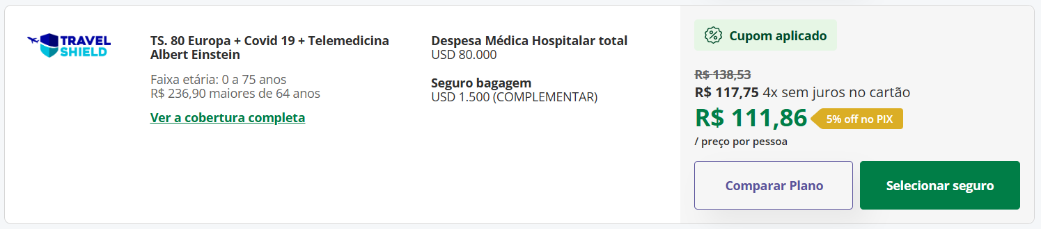 - TS. 80 Europa + Covid 19 + Telemedicina Albert Einstein: uma opção equilibrada, com USD 80.000 em cobertura médica e hospitalar, telemedicina pelo Albert Einstein, seguro bagagem e cancelamento de viagem. Com o cupom AVENTURAS15, o valor tem 15% de desconto, e pagando via PIX, o preço final fica apenas R$111,86.