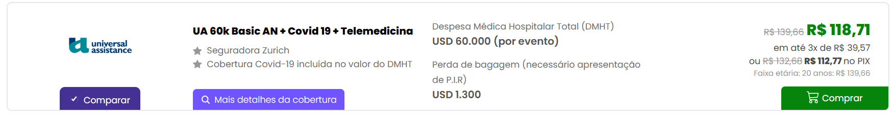 Este plano sai por R$139,66, mas com o cupom AVENTURAS15, o valor cai para R$118,71 em até 3x ou R$112,77 à vista via PIX. Uma ótima forma de garantir proteção e ainda garantir o seguro viagem Orlando com desconto!