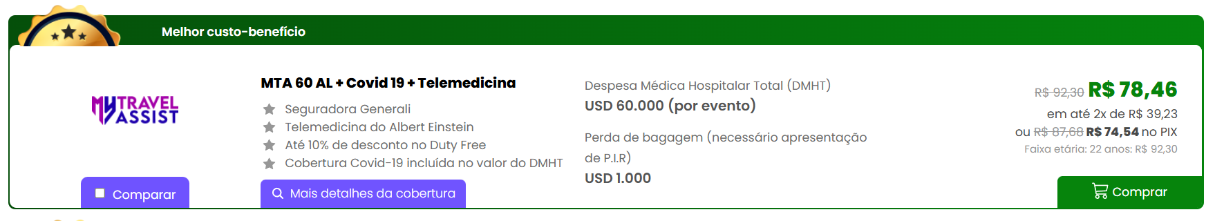 | Despesas Médicas e Hospitalares (DMH) | USD 60.000 (por evento) | USD 100.000 (por evento) | USD 35.000 (por evento) |