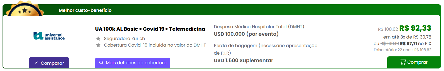 O valor do plano é R$108,62, mas com o cupom AVENTURAS15 sai por R$92,33! Pagando via PIX, o preço cai ainda mais: R$87,71. É uma super dica quando pensamos no melhor seguro viagem Chile!