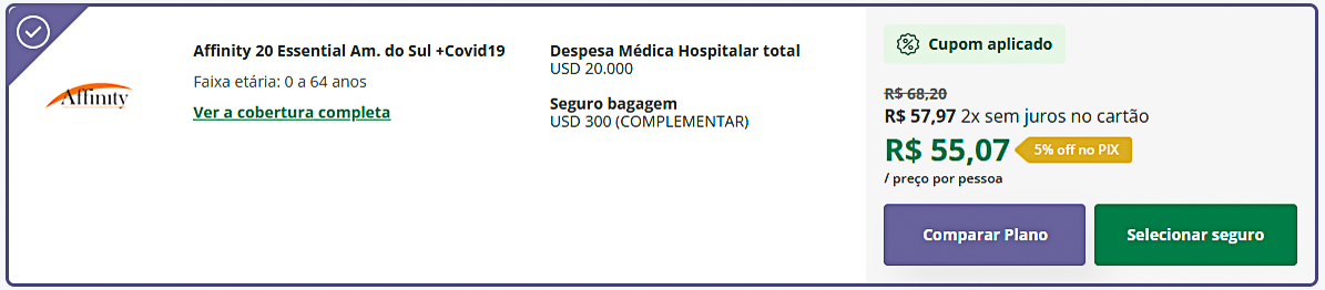 Affinity | Despesa Médica: USD 20.000 Seguro Bagagem: USD 300 |