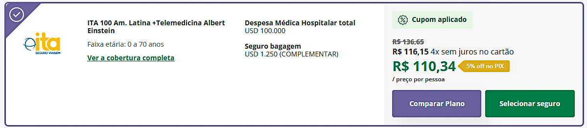 - O MTA 150 Am. Latina + Telemedicina Albert Einstein possui cobertura de despesa médico hospitalar de até USD 150 mil, além de cobertura médica para prática de esportes, seguro de bagagem extraviada de USD 1.200 e cobertura em casos de COVID. O valor deste plano para 1 semana de viagem fica em R$ 172,84.