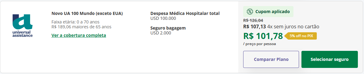 - UA 100 MUNDO (exceto EUA) COVID-19: nessa apólice, você tem direito a USD 100.000 para despesas médico hospitalares e USD 5.000 para despesas médicas de covid-19, pelo valor de R$100,52.